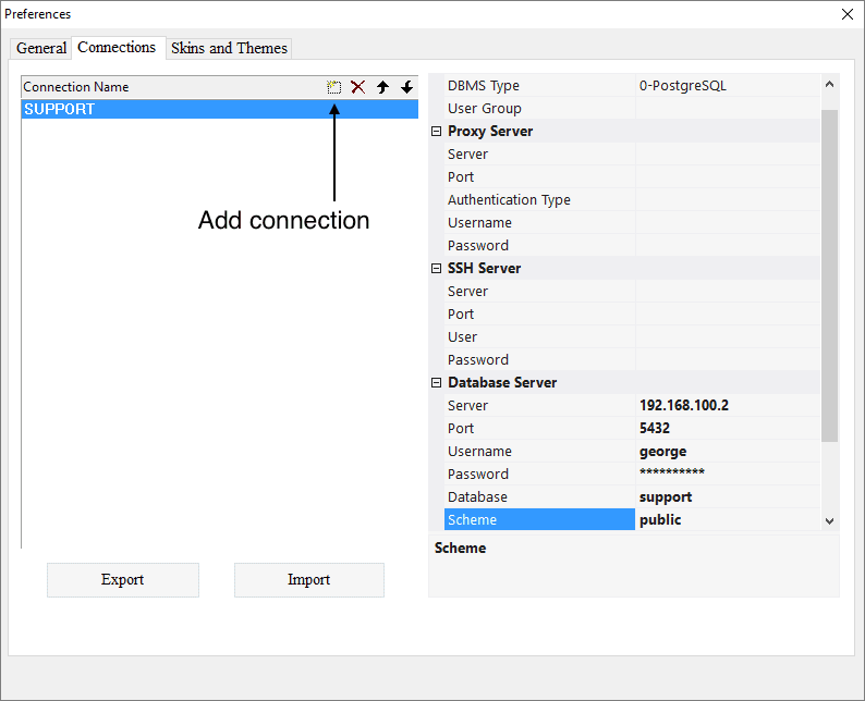 1.5.1.10. In the field Database of the section Database Server type in support;