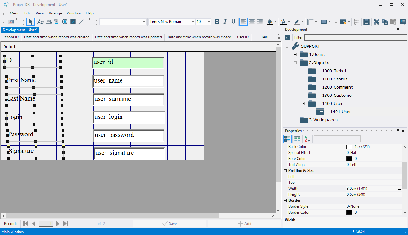 2.5.3.11. In the field Control Source for each of the added fields, choose accordingly user_name, user_surname, user_login, user_password, user_signature;
