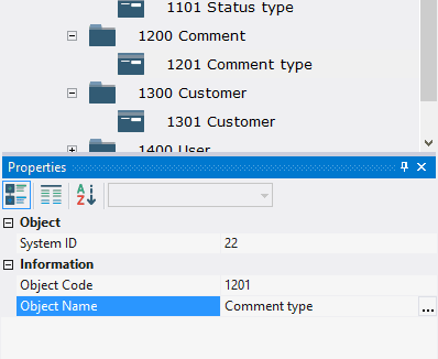 4.4.1.3. In the window Properties in the field Object Code type in 1201, in the field Object Name type in Comment type.