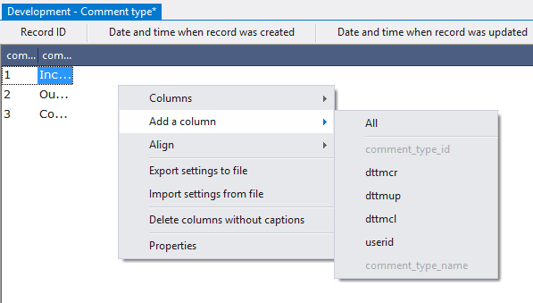 4.4.2.4. Open the context menu by right-clicking in the empty space of the object, choose Add a column and select columns comment_type_id,  comment_type_name;