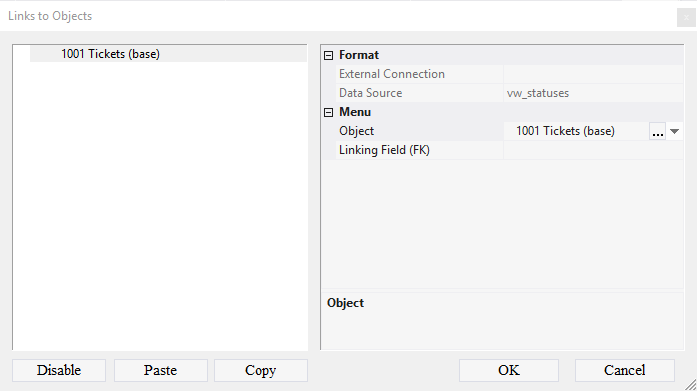 The entry selected in table 1001 Tickets (base) defines records displayed in tables 1102 Status (base) and 1202 Comment (base). For this, links between the tables should be created.