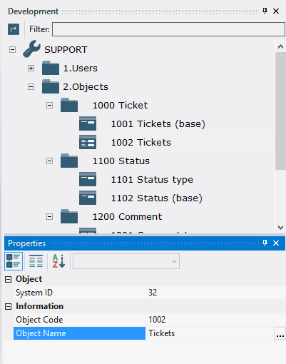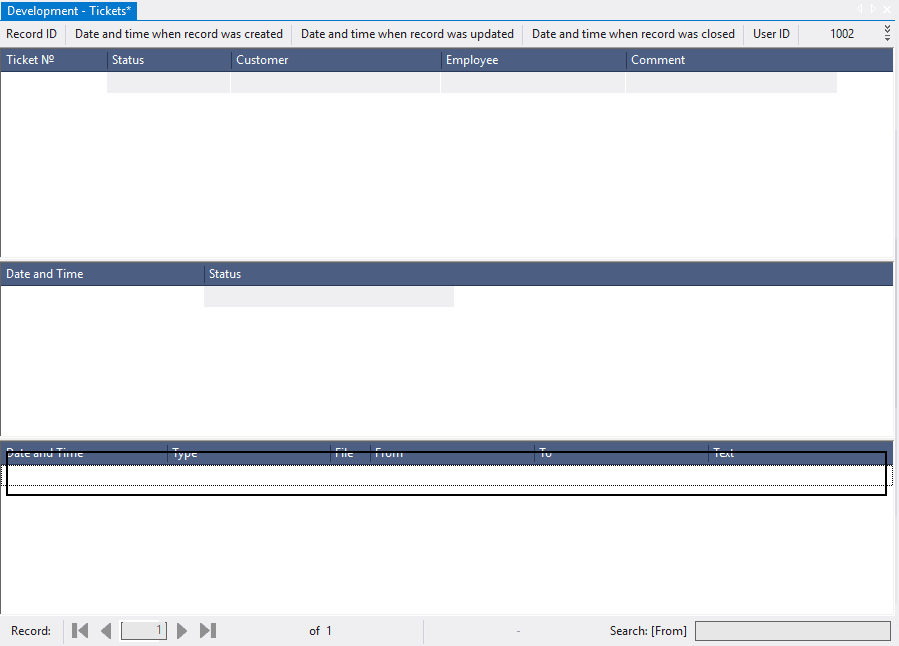 The main object to work with tickets is 1002 Tickets, that consists of the tables 1001 Tickets (base), 1102 Status (base), 1202 Comment (base). Object 1002 Tickets allows you to view not only information about tickets, but also to track the history of changes in statuses and comments.