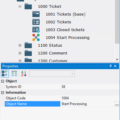 7.4.1.3. In the Properties window, enter 1004 in the Object Code field, enter Start Processing in the Object Name field;
