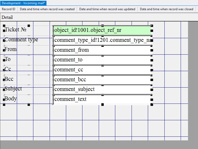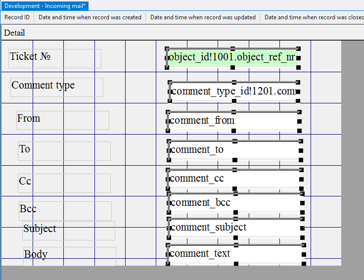 9.2.3.3. In system fields Record ID, Date & Time (Created), Date & Time (Updated), Date & Time (Closed), User ID choose fields from the table - comment_id, dttmcr, dttmup, dttmcl, userid;