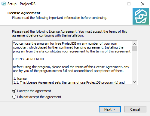 One can download ProjectDB on https://www.projectdb.ru in section Download. Downloading of the file ProjectDB_Setup.zip will start after one click on the link. After the archive is unpacked, one will get file ProjectDB_Setup.exe.