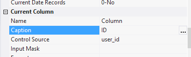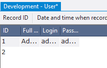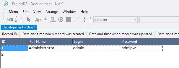 2.5.2.6. Select each column by clicking the left mouse button on any line of the table, specify in the field Caption the displayed name of the column - ID, Fullname, Login, Password accordingly;
