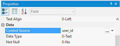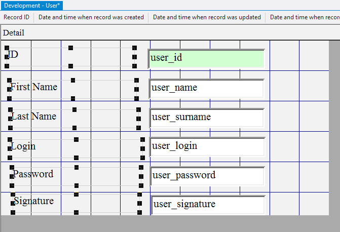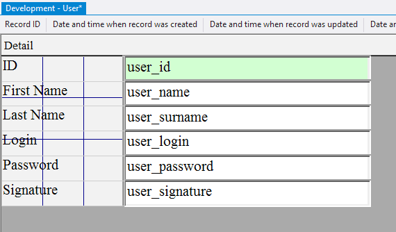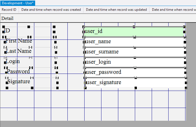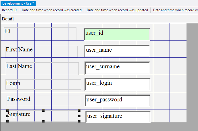 2.5.3.11. In the field Control Source for each of the added fields, choose accordingly user_name, user_surname, user_login, user_password, user_signature;