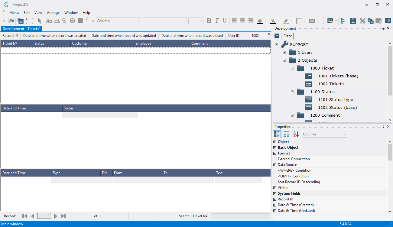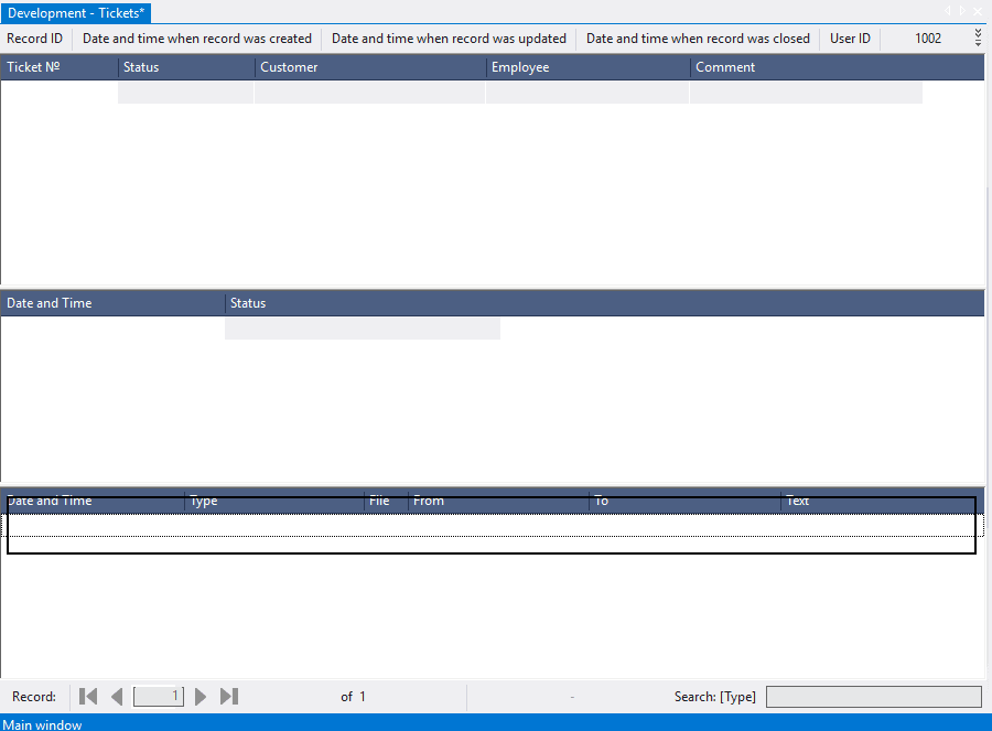 The main object to work with tickets is 1002 Tickets, that consists of the tables 1001 Tickets (base), 1102 Status (base), 1202 Comment (base). Object 1002 Tickets allows you to view not only information about tickets, but also to track the history of changes in statuses and comments.