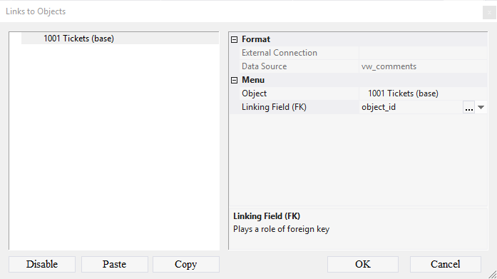 The entry selected in table 1001 Tickets (base) defines records displayed in tables 1102 Status (base) and 1202 Comment (base). For this, links between the tables should be created.