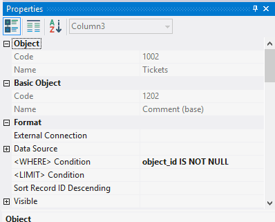 6.2.1.3. In the Properties window, enter 1002 in the Object Code field, enter the Tickets in the Object Name field.