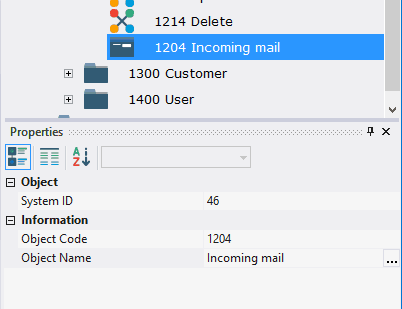 9.2.1.9. In the Properties window, enter 1204 in the Object Code field, enter Incoming mail in the Object Name field.