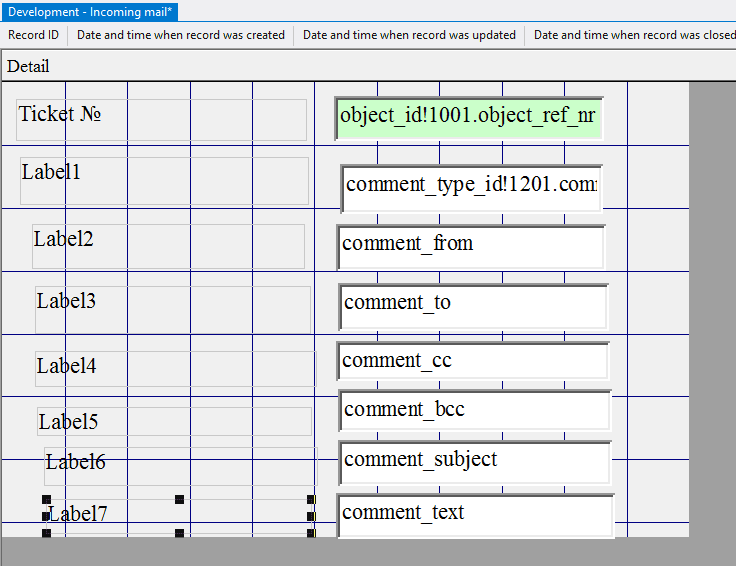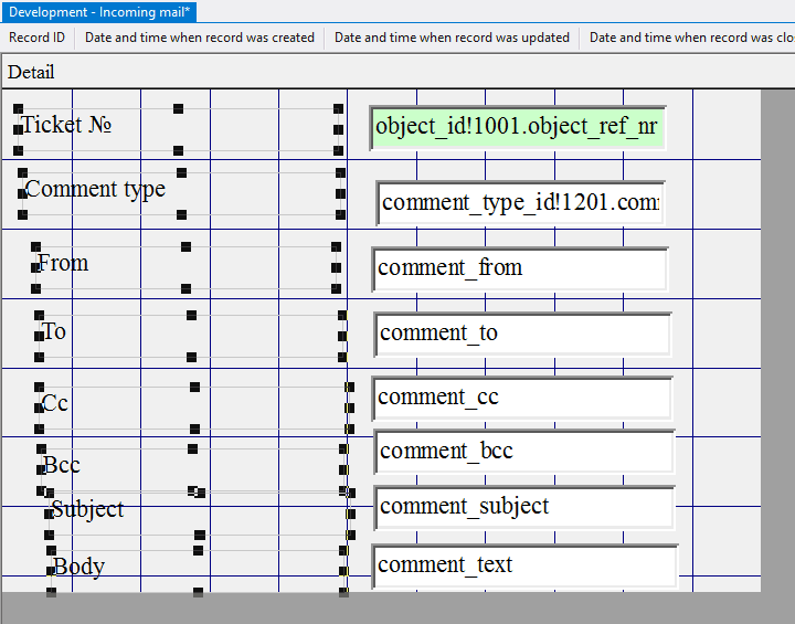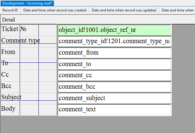 9.2.3.3. In system fields Record ID, Date & Time (Created), Date & Time (Updated), Date & Time (Closed), User ID choose fields from the table - comment_id, dttmcr, dttmup, dttmcl, userid;