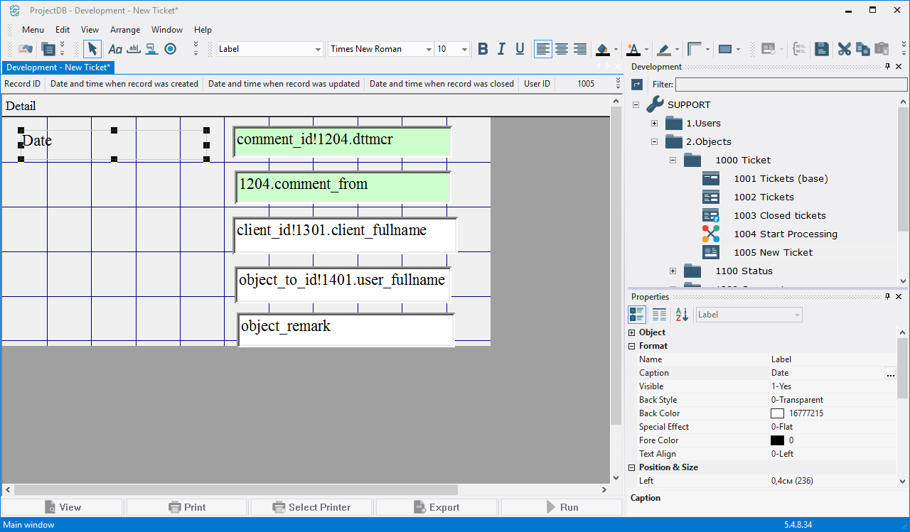 9.5.1.3. In the Properties window, in the Object Code field enter 1005, in the Object Name field enter New Ticket;