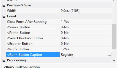 9.5.1.55. In the <Run> Button Caption, enter Register;
