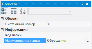 6.5.1.5. в окне Свойства в поле Код папки ввести 1, в поле Наименование пакпи ввести Обращения;