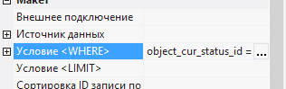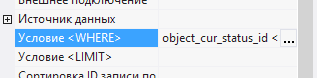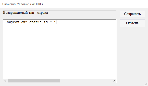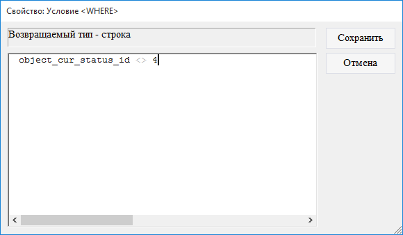 7.2.2.4. в появившемся окне ввести значение object_cur_status_id <> 4, где 4 - ID статуса Закрыто;