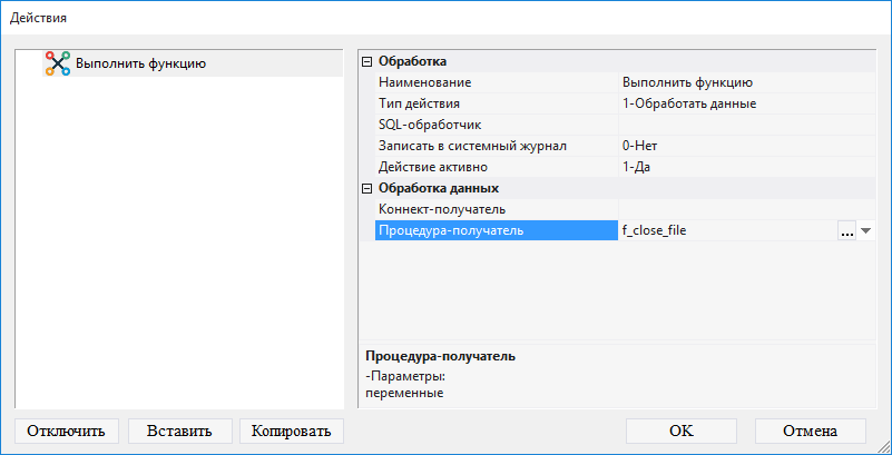 8.6.1.11. в поле Процедура-получатель выбрать функцию f_close_file;