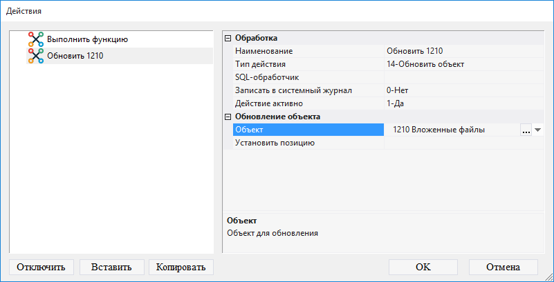 8.6.1.15. в поле Тип действия выбрать 14-Обновить объект;