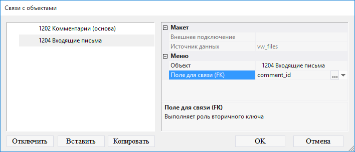 Кроме того, необходимо добавить связь между объектами 1210 Вложенные файлы и 1204 Входящие письма.